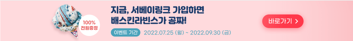 서베이링크 같은 경우, 현재 가입만 해도 배스킨라빈스 100프로 증정 이벤트를 하고 있고요! 친구 초대만 해도 포인트 제공 등 다양한 이벤트도 함께 하고 있으니, 이벤트 끝나기 전에 가입해보세요. ^^ 참고로 제가 현재 소개하고 있는 어플들은 모두 저랑 전혀 관계가 없습니다. 편하게 이용하셔도 됩니다!